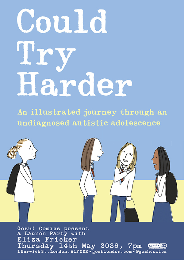 We're delighted to welcome Eliza Fricker to the shop to celebrate the release of their new graphic memoir, Could Try Harder: An illustrated journey through an undiagnosed autistic adolescence. We'll be hosting a launch party with Eliza on Thursday 14th May 2026, from 7-9pm. Here's what the publisher say about the book: